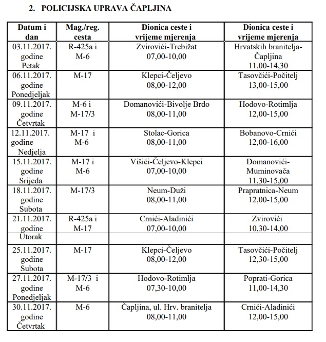 MUP Hercegovačko – neretvanske županije objavio je plan radarskih kontrola za mjesec studeni 2017. godine.
