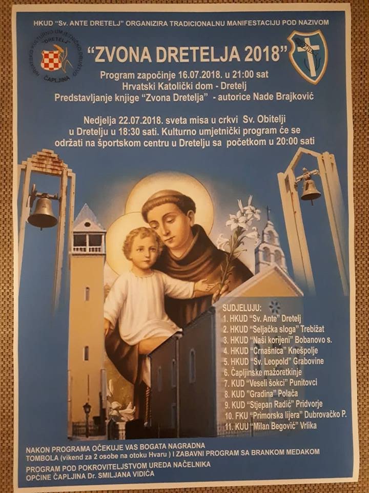 Manifestacija će započeti u ponedjeljak 16. srpnja kada će u Hrvatskom Katoličkom domu u Dretelju s početkom u 21:00 sat knjigu „Zvona Dretelja“, predstaviti autorica Nada Brajković.