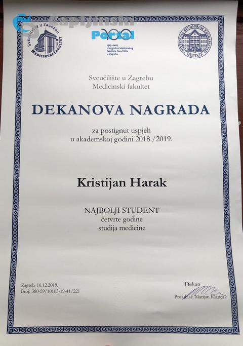 Kristijan je Dekanovu nagradu primio za postignut uspjeh u akademskoj 2018./2019. godini kao najbolji student četvrte godine studija medicine.