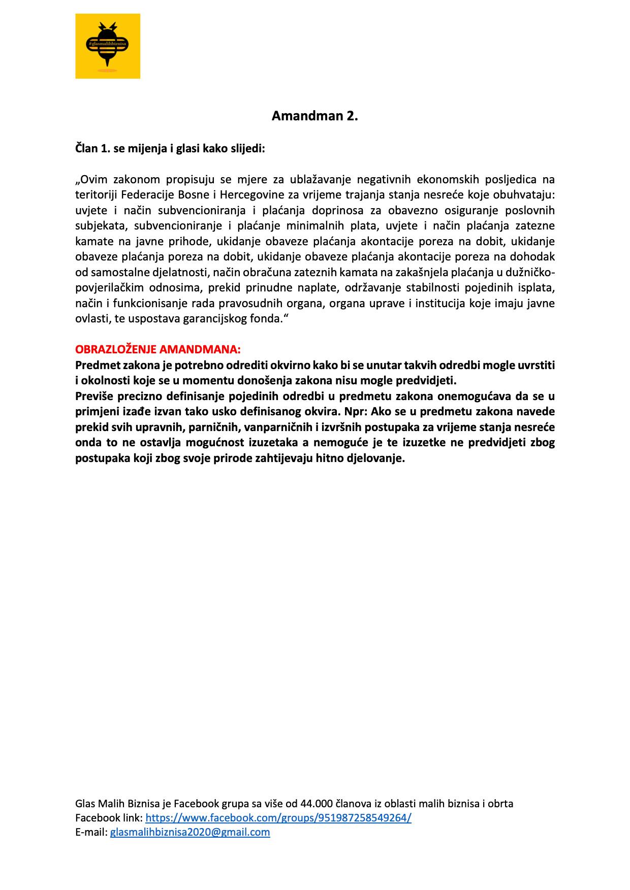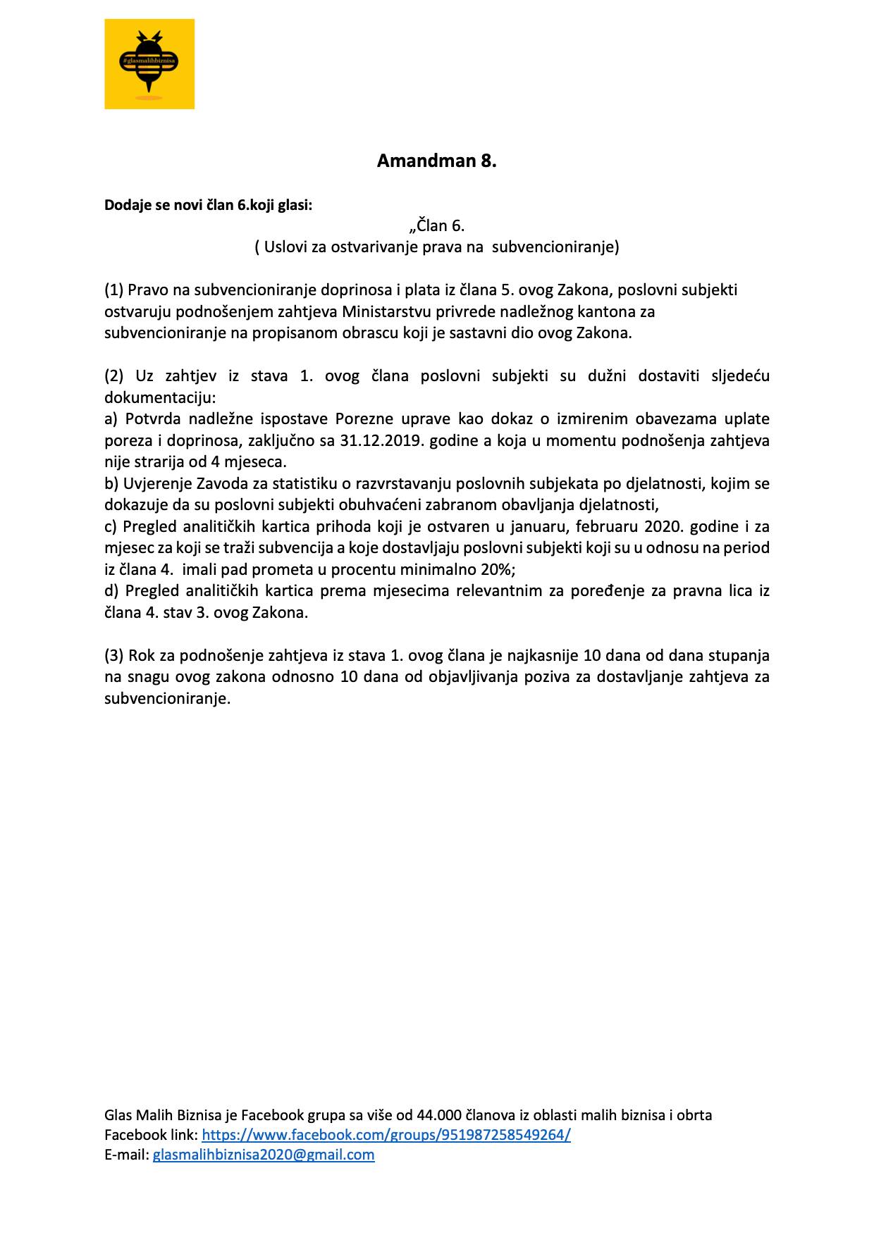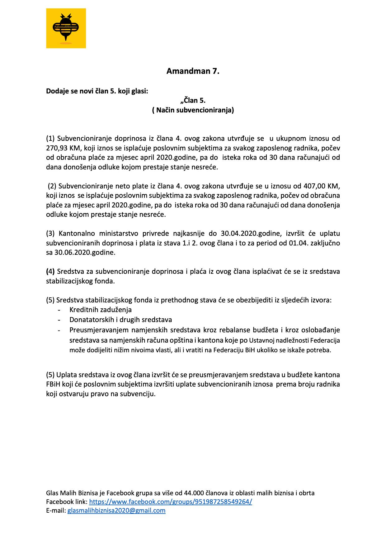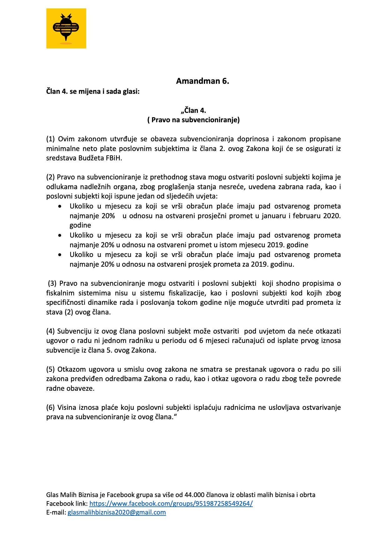Grupa ”Glas malih biznisa” koju je nakon početka pandemije koronavirusa u BiH i njezinog izrazito negativnog utjecaja na ekonomiju pokrenuo poduzetnik Ejub Kučuk uputila je 18 amandmana na stabilizacijski zakon Vlade FBiH popularno nazvan “korona-zakon”.