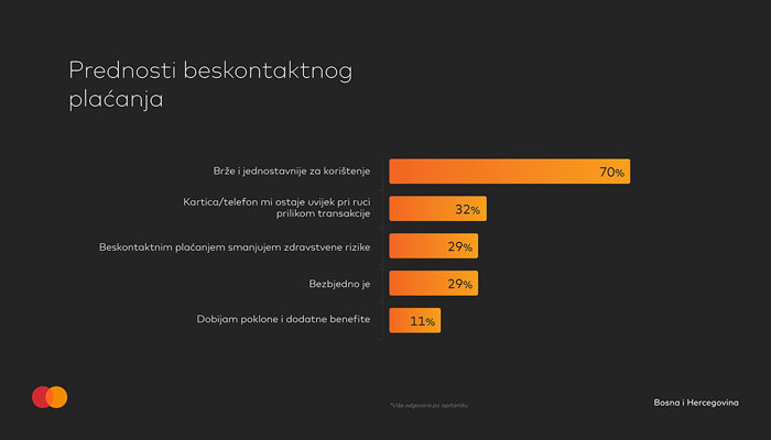 Kao glavnu prednost beskontaktnih plaćanja, MasterIndex ispitanici ističu da su ona brža i jednostavnija od drugih platnih metoda (70%), a ukazali su i na više aspekata njihove sigurnosti – počevši od toga da kartica / telefon sve vrijeme ostaje u ruci korisnika (32%), preko sigurnosnih tehnologija koje su primijenjene (29%) do činjenice da beskontaktna plaćanja smanjuju zdravstvene rizike (29%).