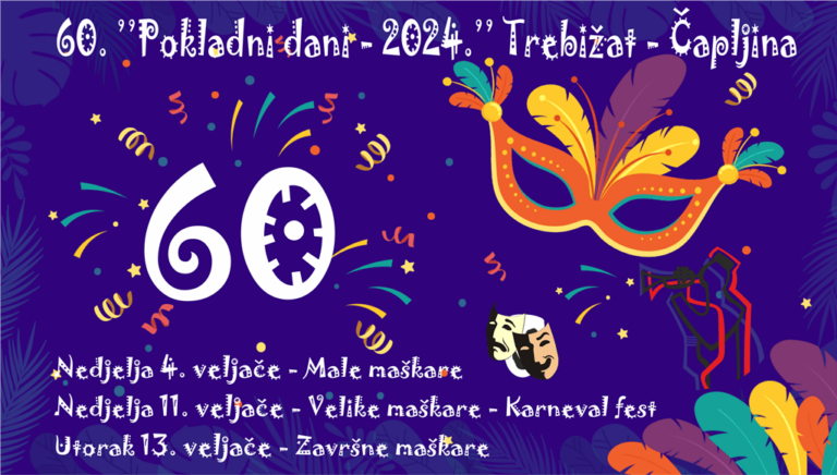 HKUD ”Seljačka sloga“ Trebižat – Čapljina će i ove, olimpijske 2024. godine, po 60. put, na radost svekolikog maškarskog puka, organizirati najstariju pokladnu manifestaciju u BiH i regiji. ”Maškarska Republika Trebižat” će svoje aktivnosti, poradi preuzimanja vlasti, izvesti po taktički razrađenom planu: Nedjelja 4. veljače: Male maškare (Dom kulture Trebižat) Nedjelja, 11. veljače: Velike maškare … Nastavi čitati Šest desetljeća veselja: Jubilarni 60. Pokladni dani Trebižat – Čapljina