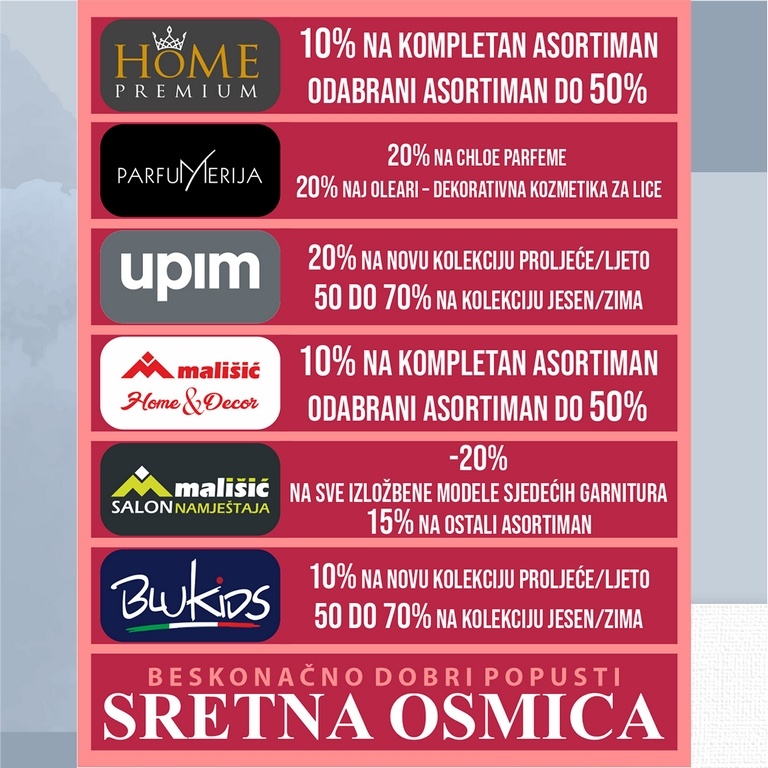 Sretna Osmica i ovog mjeseca donosi odlične akcijske popuste, pogodnosti i sniženja u prodajnom centru Mališić Međugorje.