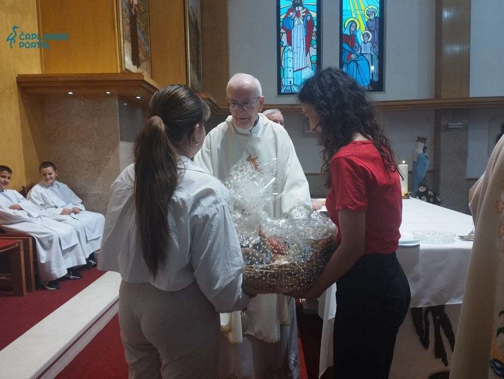 Don Aničić i Puljić dobili su prigodne poklone – krunice, vino, košaru voća od župljana i sliku.